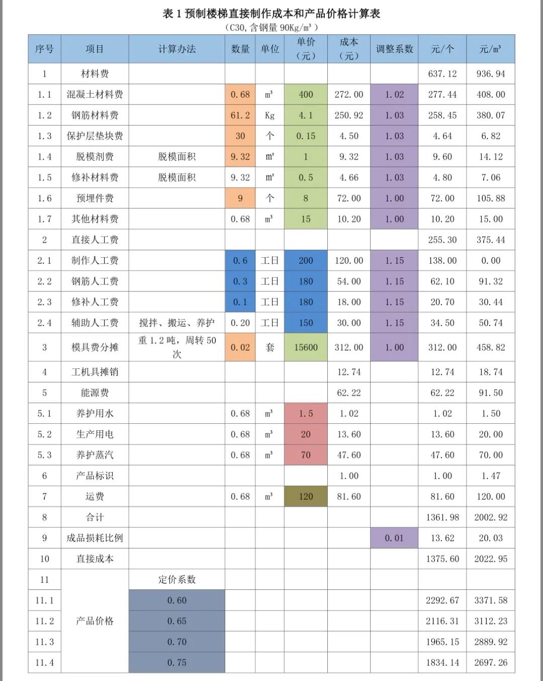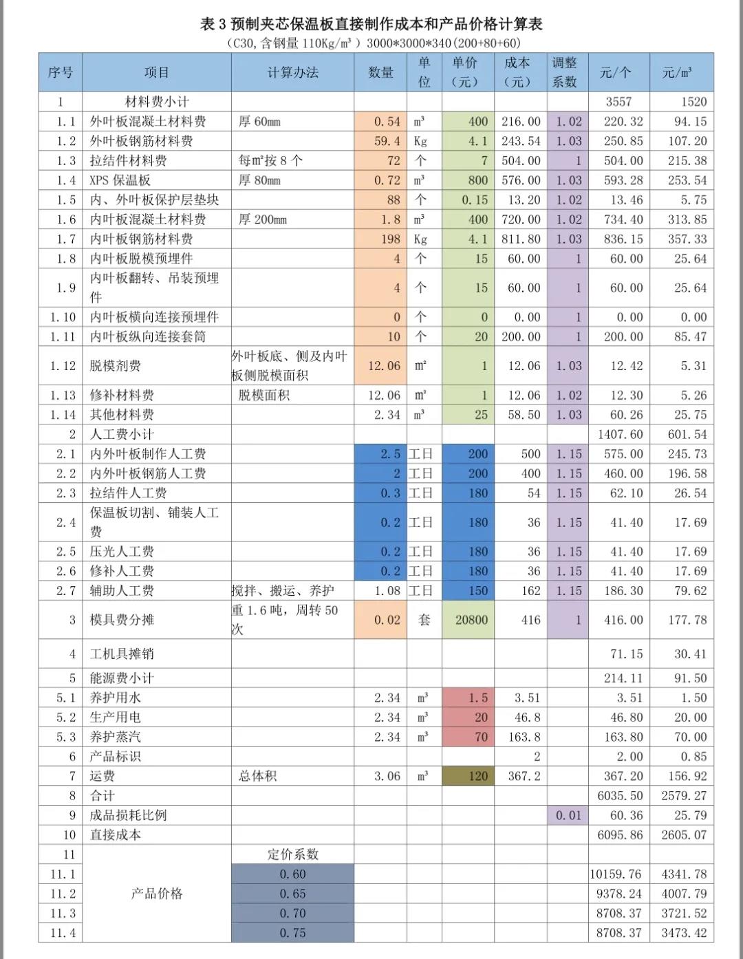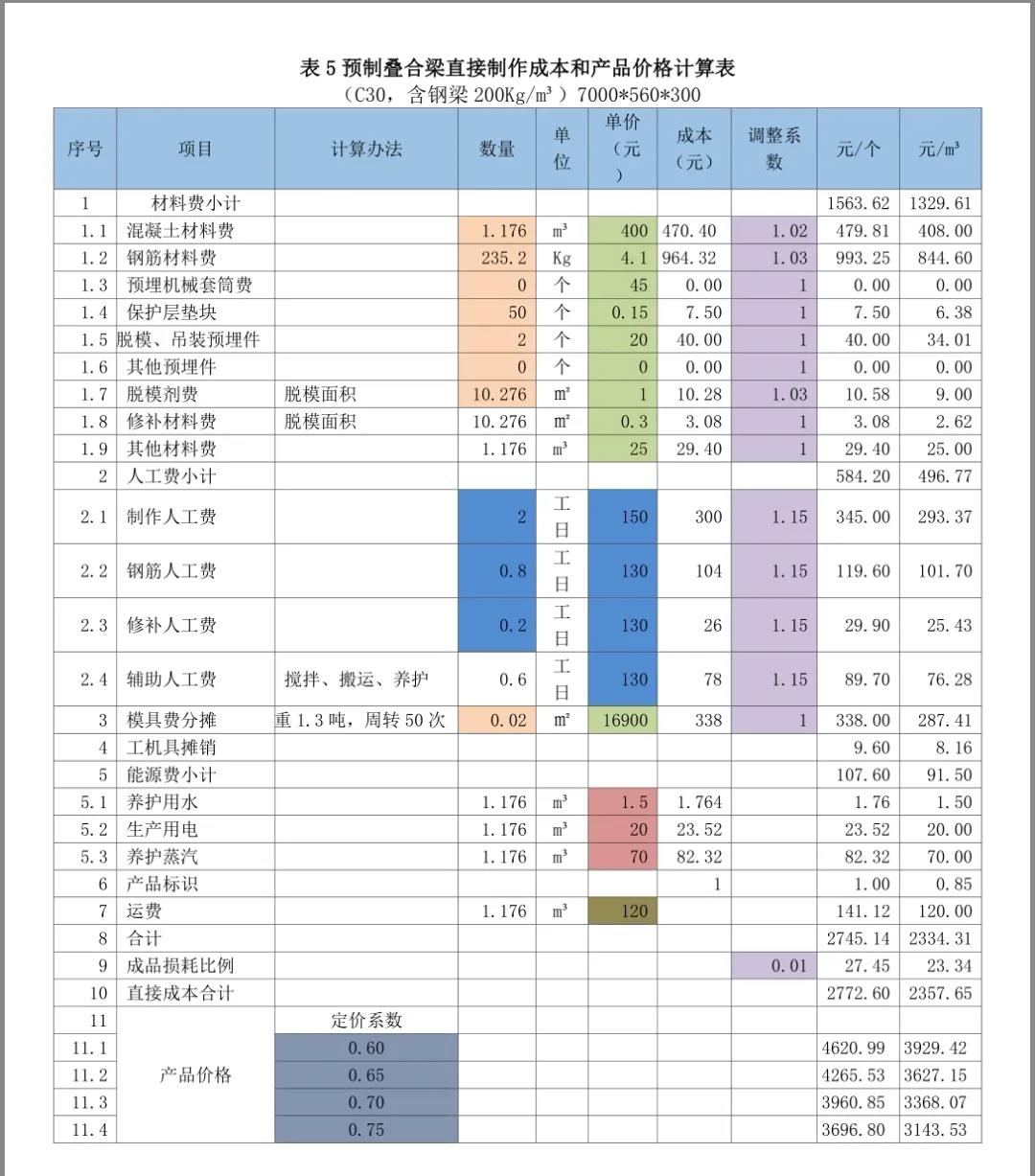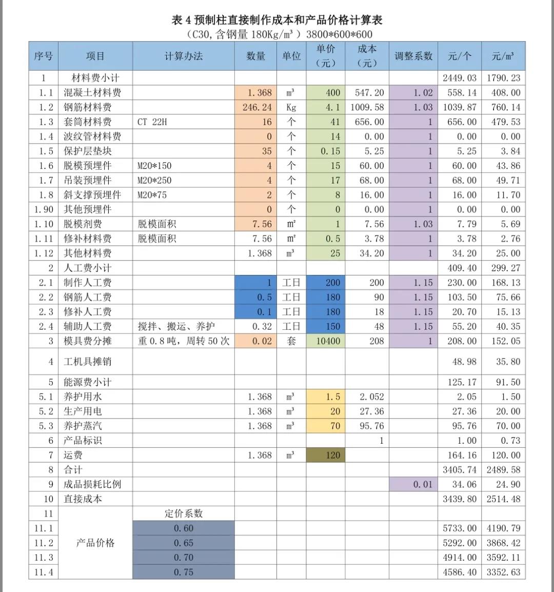 以下分享摘自紅寶書之《裝配式混凝土建筑——如何把成本降下來》,是從構件廠家的角度進行的價格組成介紹,亦可用于對預制構件價格合理性判斷的方法。2)然后計算費用(包括間接制作成本、營銷費用、財務費用和管理費用)、稅費和利潤這三個方面在價格中的比例。3)用100%減去上述的比例,就得到了定價系數(shù)——直接制作成本在價格中的比例。4)用直接制作成本除以定價系數(shù)就得到了預制構件價格。即:預制構件價格=直接制作成本/定價系數(shù)。通過成本要素統(tǒng)計法,計算得到某一類預制構件的直接制作成本是1800元/m3。通過對以往數(shù)據(jù)的統(tǒng)計和計劃預算的分析,確定費用(包括間接成本、營銷費用、財務費用和管理費用)占預制構件價格的比例為20%。通過對增值稅抵扣情況的統(tǒng)計分析和土地使用稅和房產稅的分攤,稅費占預制構件價格的比例為10%。根據(jù)企業(yè)經營目標,確定預期的利潤率為10%。匯總上述比例,該構件的費用、稅金、利潤占預制構件價格比例的合計為40%。100% - 40%=60%;定價系數(shù)為0.60。需要注意的是,在計算和確定預制構件的定價系數(shù)時,要根據(jù)費用分攤占預制構件價格的比例、預期的利潤率和稅費在預制構件價格中的比例,根據(jù)市場行情的分析,根據(jù)企業(yè)狀況和定價策略等因素確定。預制構件銷售價格=直接制作成本/定價系數(shù)=1800/0.60=3000元/m3。也可以用Excel表方便的進行預制構件直接制作成本和產品價格計算。以下測算表格為舉例說明,各項數(shù)據(jù)僅供參考。表3預制夾芯剪力墻保溫板直接制作成本和產品價格計算表;1)成本欄為數(shù)量欄與單價欄的乘積;調整后成本欄為成本欄與調整系數(shù)欄的乘積;小計為各分項成本的合計;每個預制樓梯、每平方米疊合樓板、每個預制柱、每個預制梁、每塊預制夾芯保溫板造價為直接成本除定價系數(shù);每立方米造價為每個預制樓梯造價、每平方米疊合樓板、每個預制柱、每個預制梁、每塊預制夾芯保溫板造價除混凝土材料數(shù)量。2)在表里只要填寫或修改相關項目數(shù)量、單價、調整系數(shù)及定價系數(shù)(表中標記有顏色的部分),就會得到預制構件的直接制作成本和不同定價系數(shù)下的產品價格。①材料數(shù)量、模具費計算使用的數(shù)量由技術部門提供(橘色)。②材料單價、模具單價(以下各表均按13元/Kg)由采購部門提供(混凝土如果是企業(yè)自產的話,價格可以另行計算而得)(綠色)。③人工費數(shù)量和單價由人力資源部門協(xié)同定額管理部門提供(藍色)。④工機具攤銷(以下各表取材料費的2%)由財務部門提供。⑤每立方米預制構件需要的水、電、蒸汽費由能源管理部門提供(黃色)。⑥每立方米預制構件運費由運輸管理部門提供(土黃色)。4)材料和成品考慮到損耗,增加了調整系數(shù)(紫色)。5)人工費調整系數(shù)是指工資中還應包括勞動保險、公積金、工會經費、其他福利費、勞保費用,勞務公司工人包括勞務公司的管理費等,適當分攤淡季待工時的人工費用。本章內容節(jié)選自紅寶書之《裝配式混凝土建筑——如何把成本降下來》,購買請點擊下面小程序:(注:蘋果手機用戶,請點擊文末“閱讀原文”)